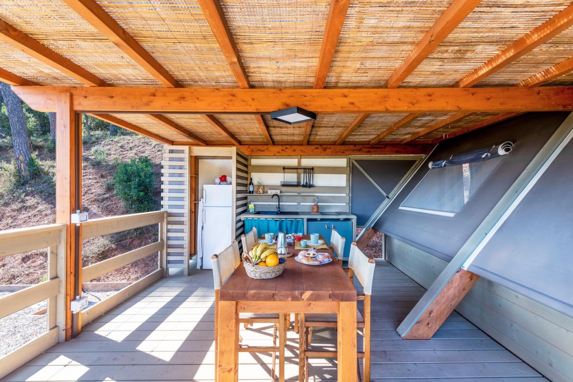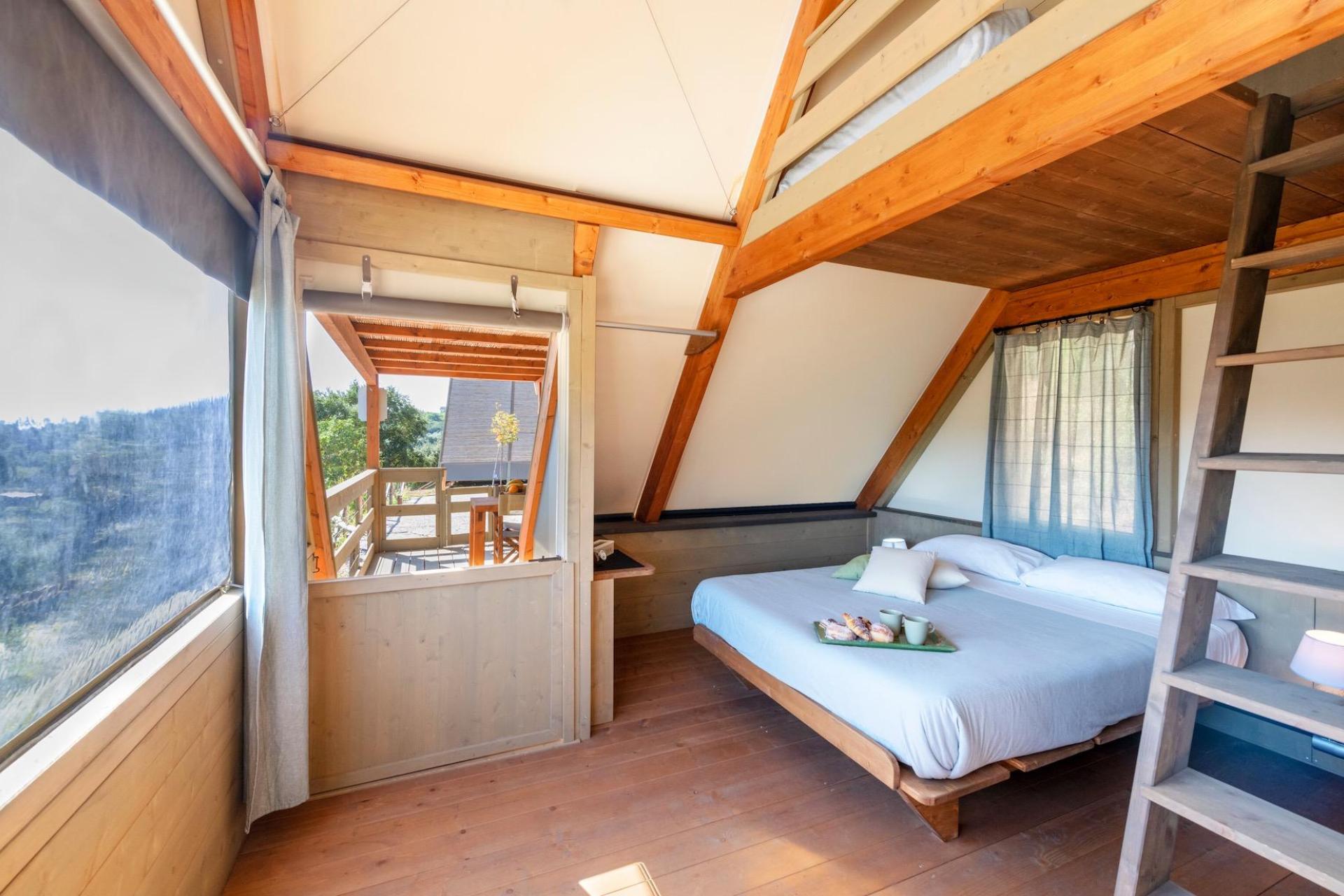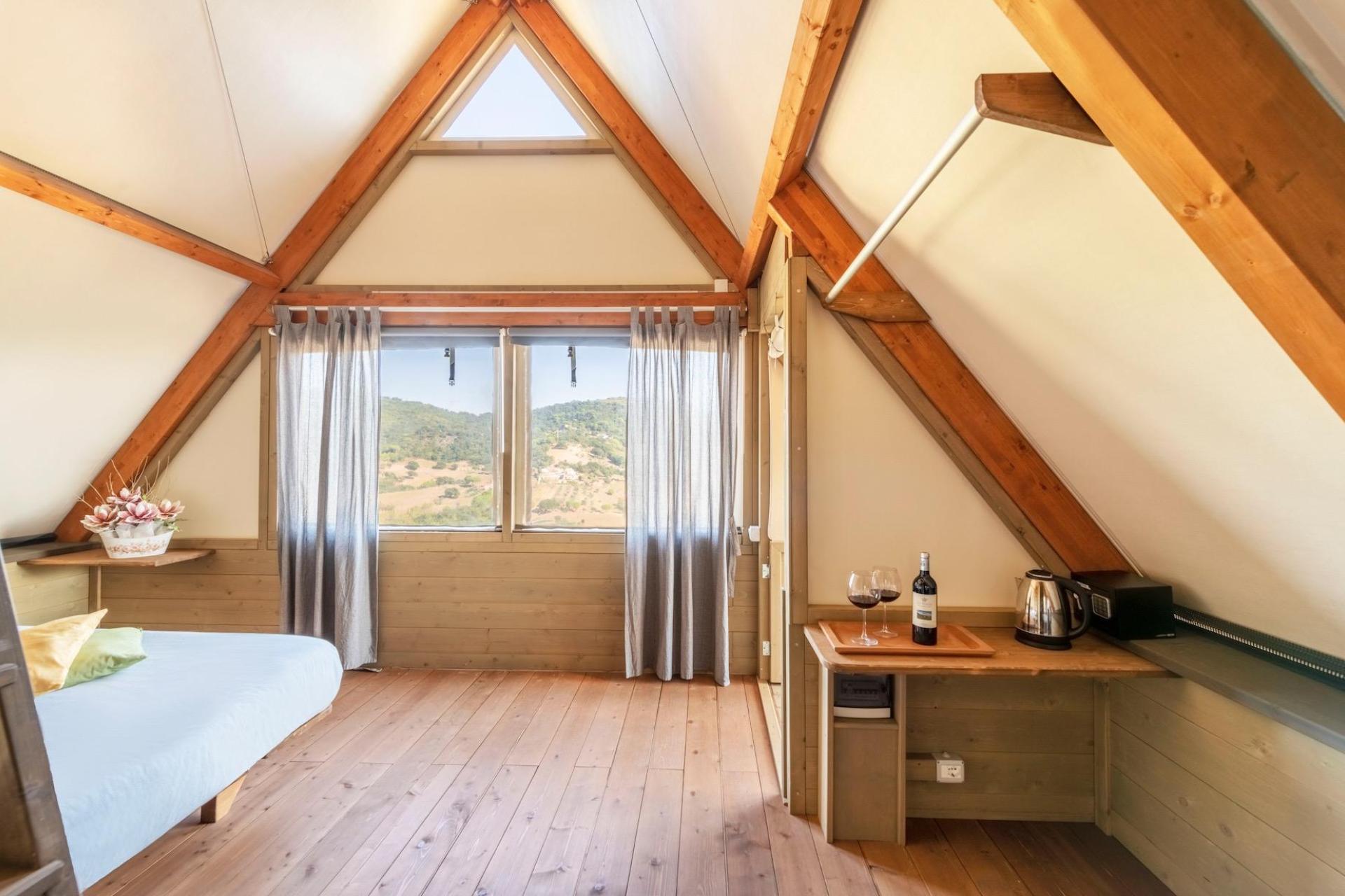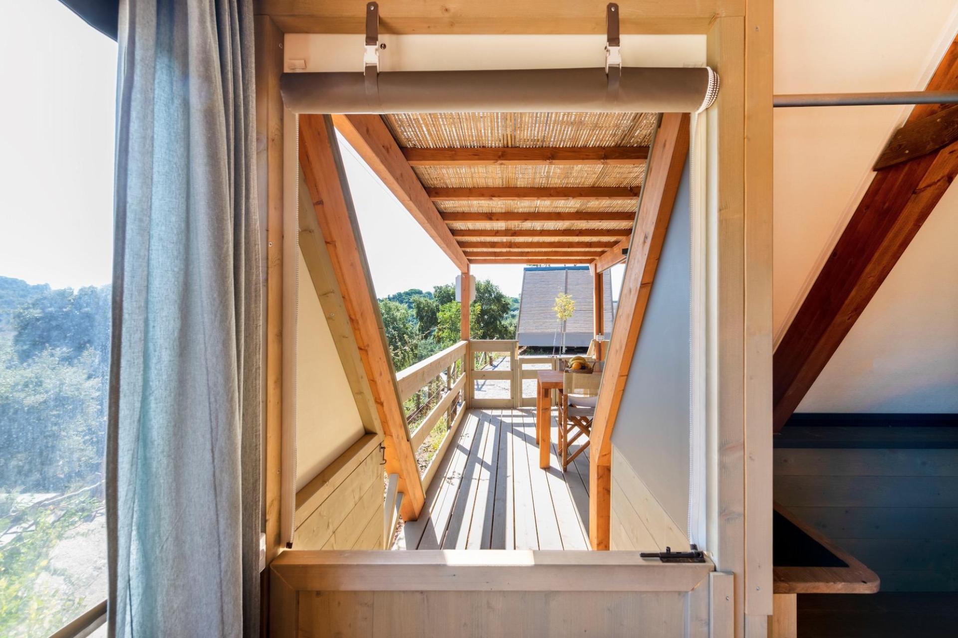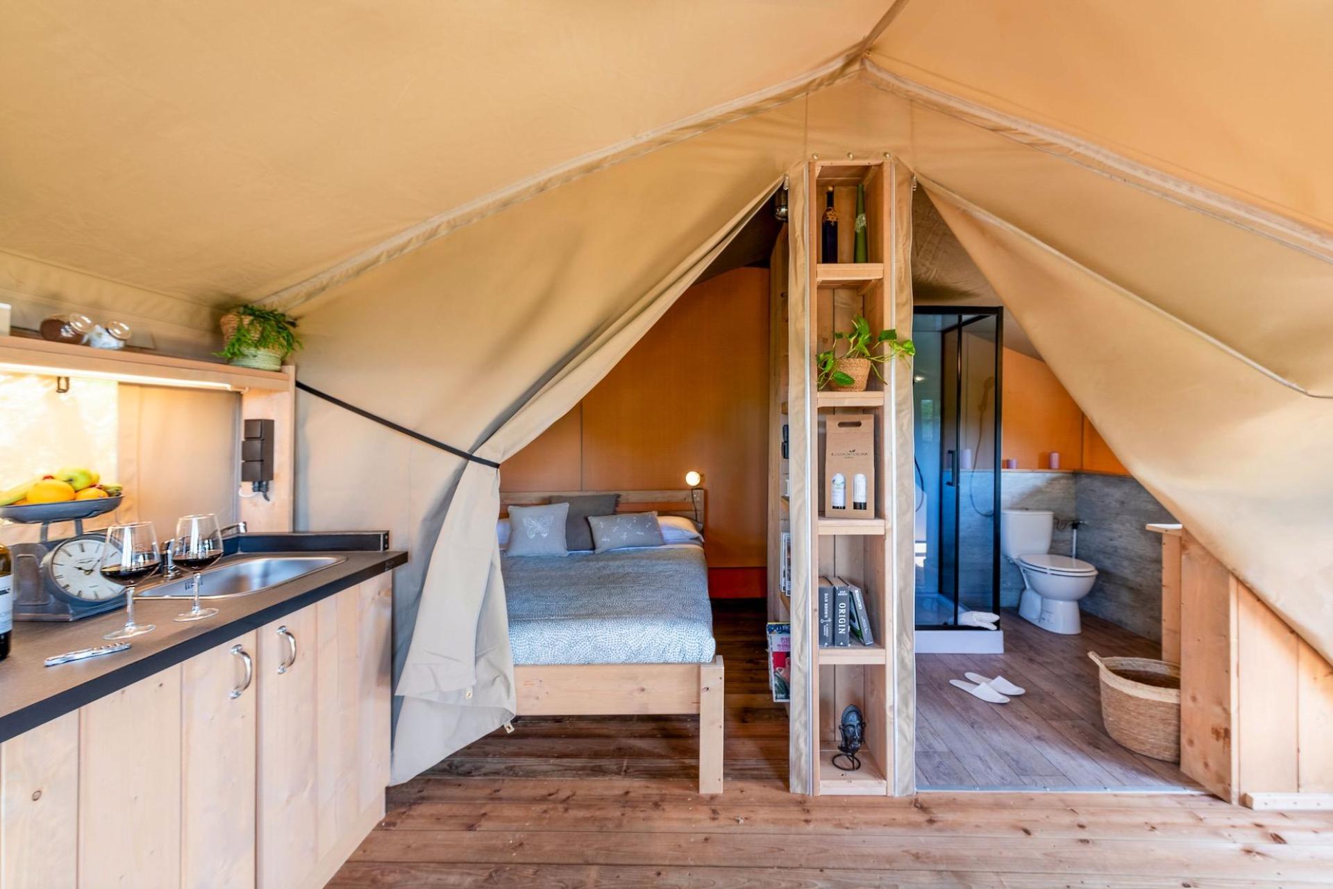 After parking your car, you reach your tent via steps leading up the hillside. The tents are furnished with natural materials and soft colours, combining the outdoor experience of camping with the comfort of modern accommodation. Each tent has a veranda with open views and is equipped with a fully fitted kitchenette with induction hob, fridge and cooking utensils, a private bathroom with shower, and modern facilities such as air conditioning, Wi-Fi and a safe. The various tent types are suitable for both couples and families and offer a pleasant balance between comfort and simplicity.