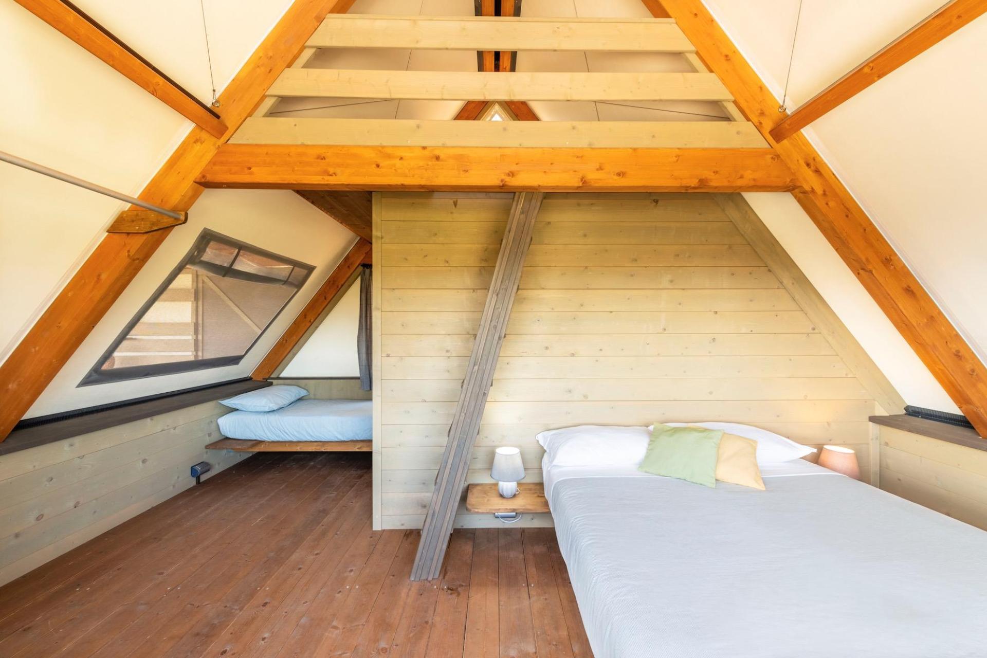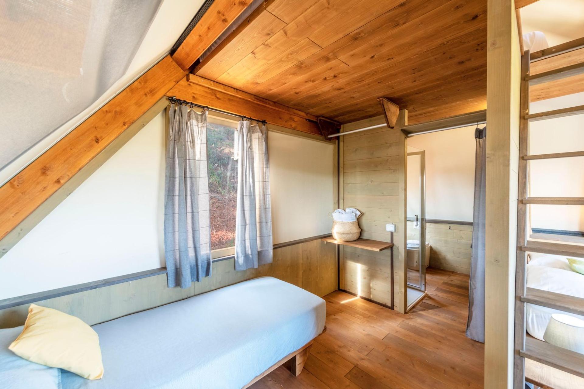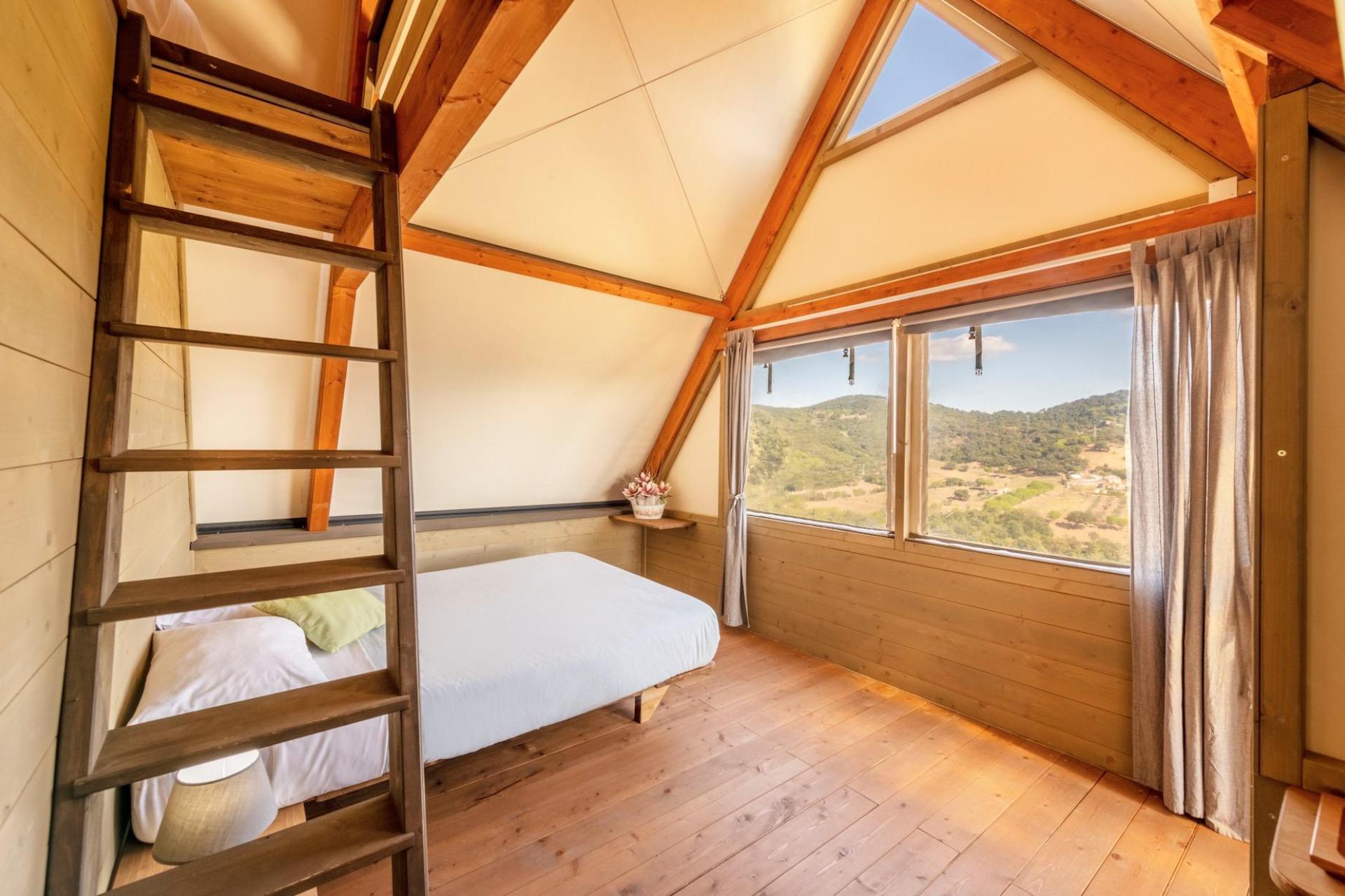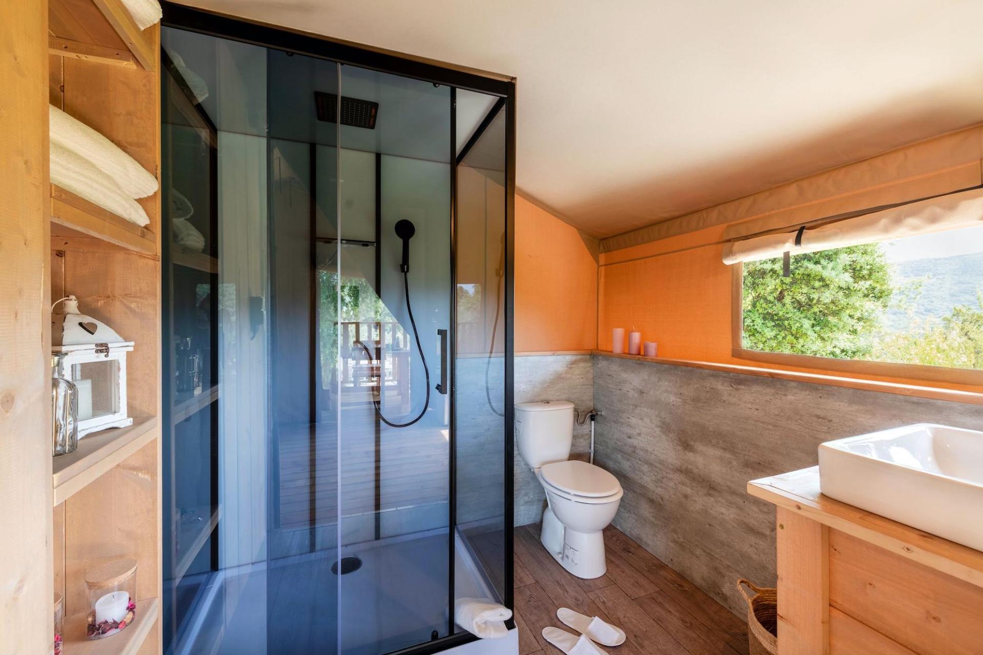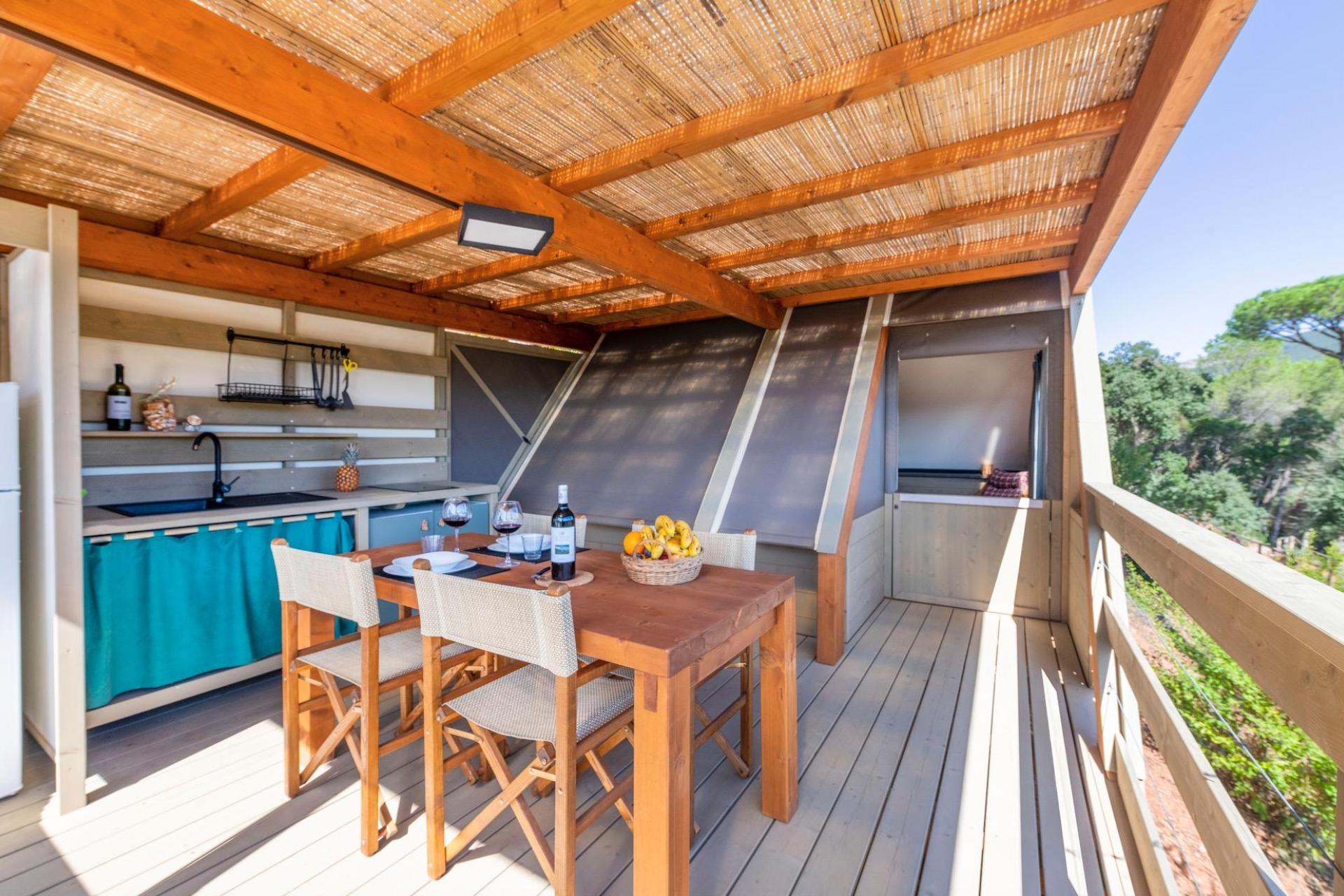 After parking your car, you reach your tent via steps leading up the hillside. The tents are furnished with natural materials and soft colours, combining the outdoor experience of camping with the comfort of modern accommodation. Each tent has a veranda with open views and is equipped with a fully fitted kitchenette with induction hob, fridge and cooking utensils, a private bathroom with shower, and modern facilities such as air conditioning, Wi-Fi and a safe. The various tent types are suitable for both couples and families and offer a pleasant balance between comfort and simplicity.